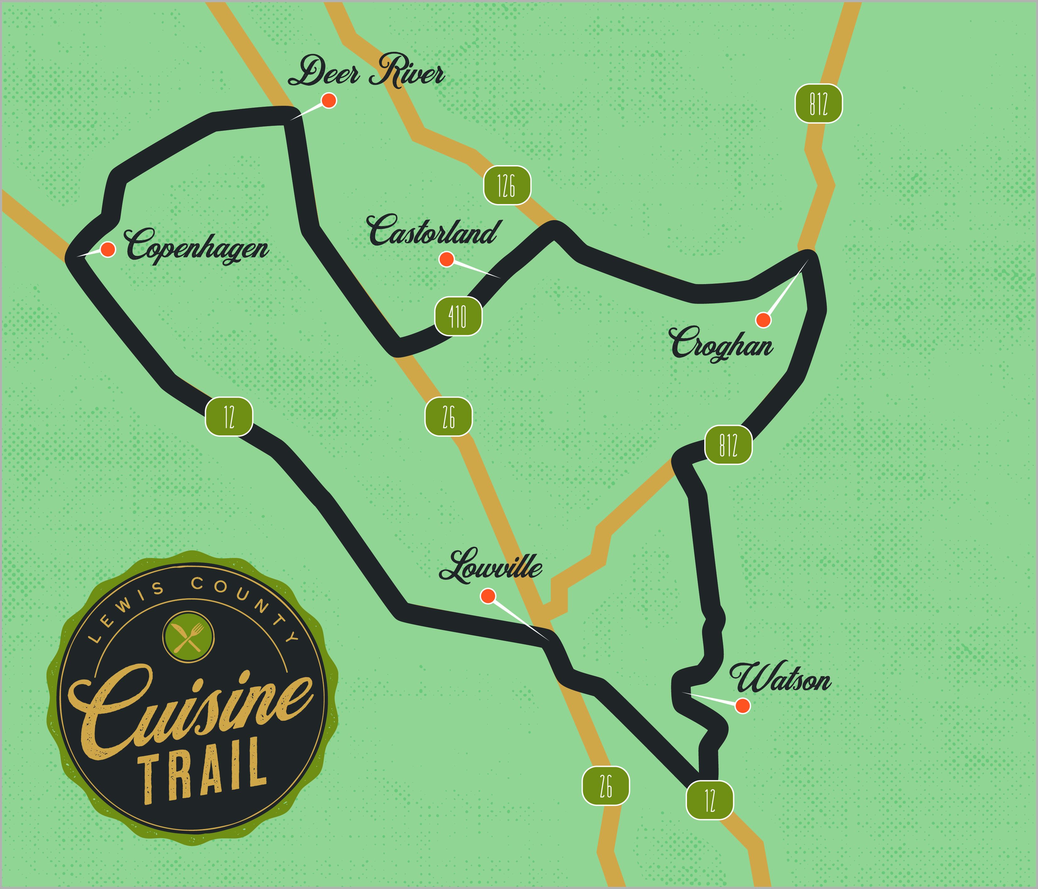 The Lewis County Cuisine Trail travels through back roads to the Villages of Lowville, Croghan, Castorland and Copenhagen and showcases locally sourced and produced foods unique to the area. From goat farms, to cow dairies, to farmer owned cooperatives, the International Maple Museum, famous Croghan Bologna, and restaurants carrying local products, the Lewis County Cuisine Trail offers a little bit for everyone.